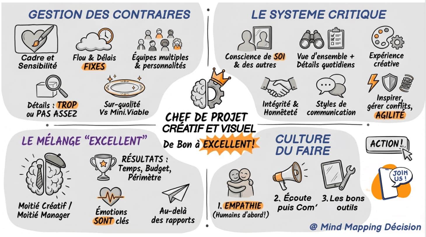 Cet article explore ces méthodes concrètes, ancrées dans les neurosciences cognitives et testées par Mind Mapping Décision en entreprise. Découvrez comment les directeurs, managers et chefs de projets font du management créatif un levier pour l’innovation et la compétitivité de leurs équipes et organisations. Découvrez votre profil de Leader Visuel.